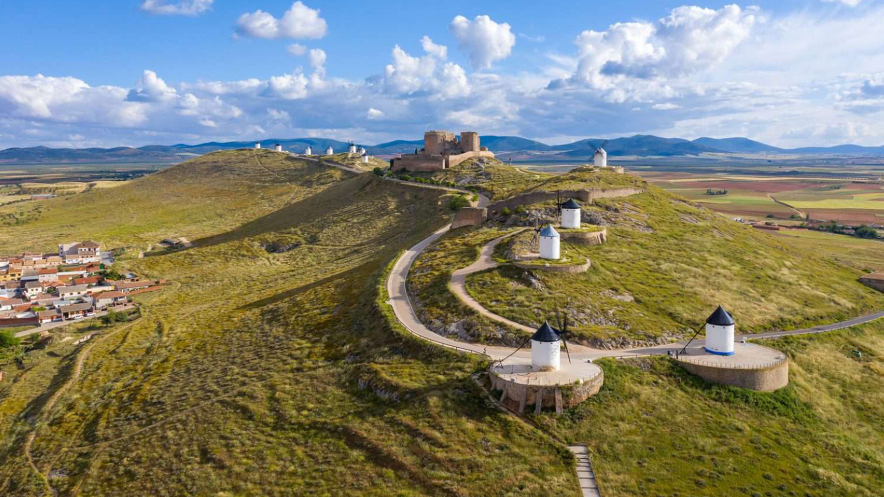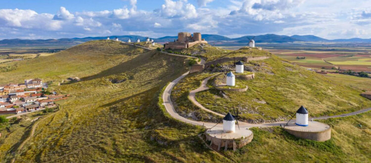 Nuestra primera parada es, posiblemente, la estampa más espectacular de la comarca. A tan solo 15 minutos de Puerto Lápice, en lo alto de un cerro, se alinean 12 molinos de viento junto a un imponente castillo medieval.